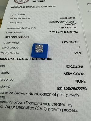 2.06CT F VS2 EX VG CVD ห้องปฏิบัติการเพชรเติบโตเจ้าหญิงตัด IGI ใบรับรอง